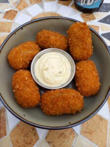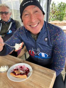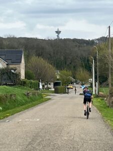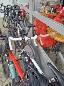 ‘Lex merkte op vrijdagmiddag dat de klimmetjes in de groep ‘meer genietende fietsers’ toch teveel energie eisten en besloot zich aan te sluiten bij Tjebbe en mij. Bergop haal ik alles en iedereen in met die stoere e-bike, maar op het vlakke stuk gaat die stoere fiets niet harder dan 26 km/uur en dan is het heel zwaar trappen op een fiets van 32 kg. We reden vandaag de route van 82 km. Een schitterende route over heel rustige wegen. Het begon heel koud maar met de ervaring van gisteren hadden we de juiste kleding aan bij vertrek en al spoedig kon het een en ander uitgetrokken worden. Dat kon mooi in mijn fietstas. De koffiestop zou bij restaurant Windraak 31 zijn. Helaas wees Google Maps ons de verkeerde kant op: 200 meter naar links (of ik had niet goed opgelet). Tjebbe sprintte alvast vooruit en hield geen rekening met de afstand. Na ruim een kilometer waren we beneden en hadden geen restaurant gezien. Terug naar Windraak want daar had Tjebbe in een klein straatje een koffiedingetje gezien. Dat bleek gewoon bij iemand thuis in de tuin te zijn. Heerlijke koffie met vlaai en notencake voor een vooroorlogse prijs. Daarna fietsten we weer rustig door. De volgende stop was de Bernardushoeve met een heerlijk terras in de zon. Kroketten met brood voor Lex en een Croque Madame voor Tjebbe en mij. We zagen op het terras wel de lucht donkerder worden en de weersapp gaf ook aan dat het om 17.00 uur zou gaan onweren en stortregenen. Maar wij waren ruim voor tijd binnen in De Brakke Berg. Even een drankje en dan naar boven om te douchen en te relaxen. Het was een heerlijke tocht over wegen die niets te maken hadden met de Amstel Gold routes zodat het lekker rustig fietsen was. Alle hulde voor de routemaker, Martijn.’