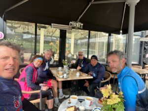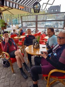 De koffiestop was op een heerlijk terras in de zon, waar het uitpellen van te warme kleding begon. Koffie met een heerlijk stuk vlaai erin en verder voor deel twee.