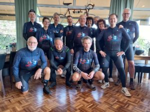 Een mooi kiekje rijker stapten we weer op de fiets. De pelotons zagen er vandaag iets anders uit. De ‘zware jongens’ waren aangevuld met Jeroen en verlaten door Jelle vanwege pech. Bijna had Peter Jan ook afgehaakt, maar hij kon gelukkig later toch nog aanpikken. De groep meer genietende fietsers had Jeroen afgestaan aan de ‘zware jongens’ en Lex aan Tjebbe en Ria meegegeven. De afstanden logen er niet om: 100 km met 1050 hm of 155 km met 2000 hm.